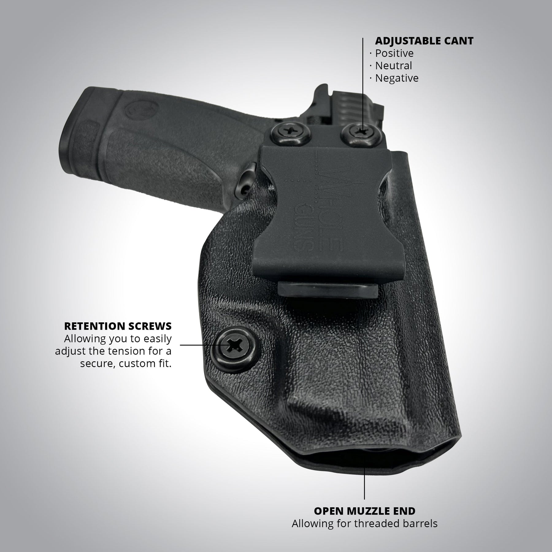 - Discover unparalleled versatility with our holster's adjustable 'cant' feature, which allows you to customize the angle of your holster to your liking. With an adjustable range of -5 to +20 degrees, you can find the perfect angle that suits your comfort and convenience.