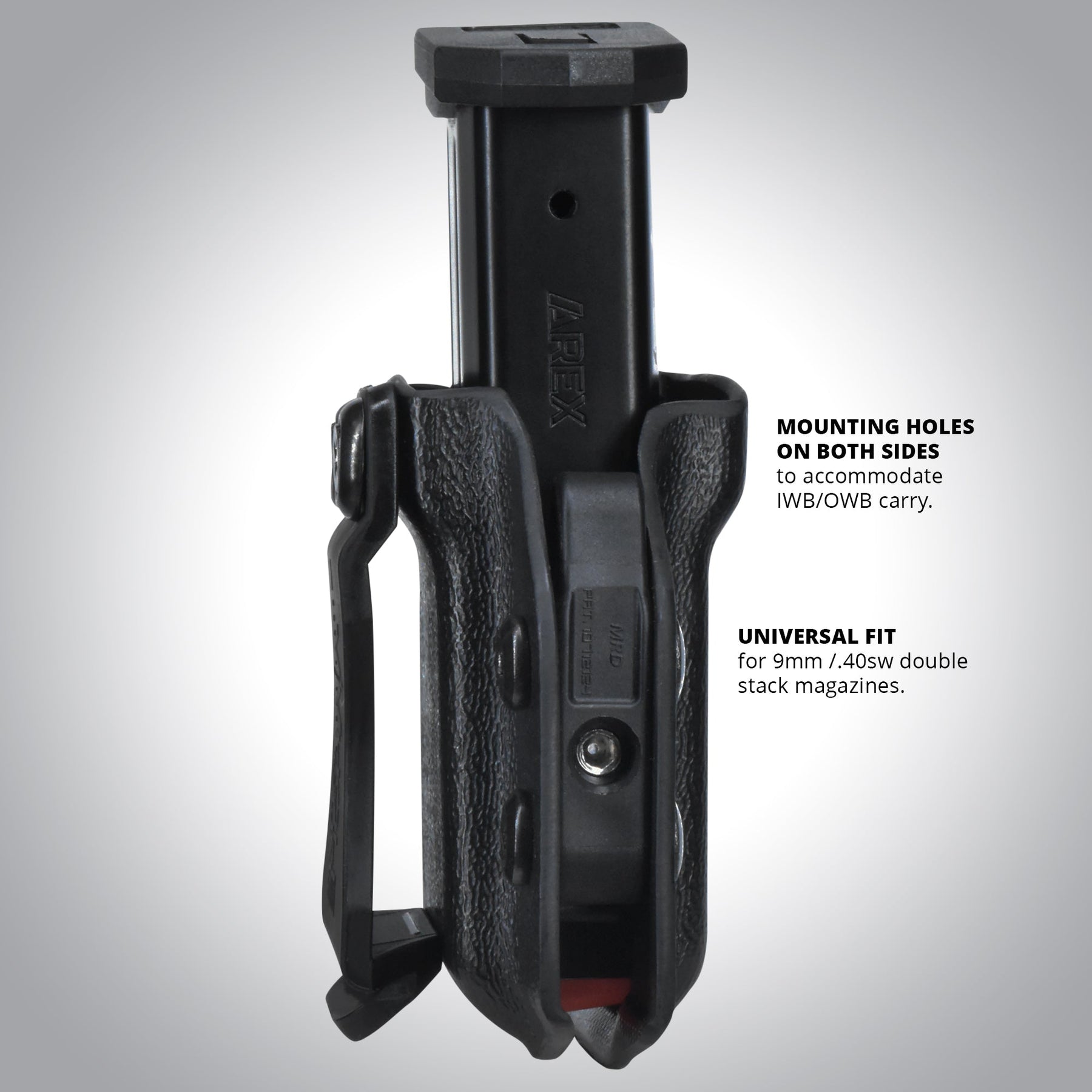 Ambidextrous, Single Magazine Holster. Carry your spare mag with you at all times. Extremely versatile with mounting holes on both sides to accommodate your preferred carry position for either IWB/OWB Carry and Right Hand/Left Hand Draw. Mag Holster comes fully assembled for RH IWB Carry, but is easily reconfigurable with just a Phillips screwdriver. Our Universal MRD magazine Pouch comes with a 1.5" Belt Clip. The MRD Mags are universal for the caliber and round configuration Mag Retention is easily adjustable via the Allen Key.